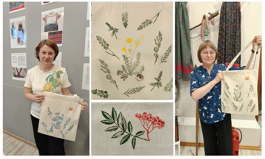 Вместе с Александрой Авнигиной и Татьяной Поторий рукодельницы изучали этот интересный способ декорирования тканей и создавали экосумки с рисунками из трав и цветов.